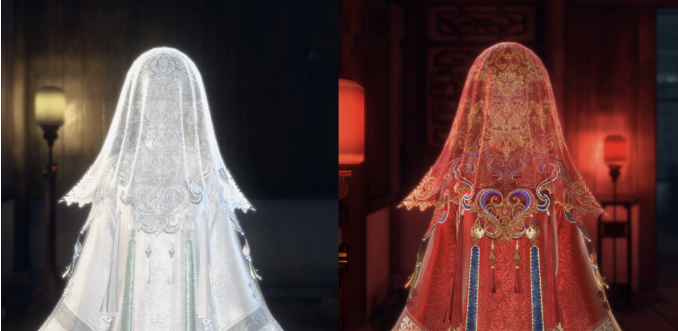 联动古风外观【幽梦逢她】融合婚嫁与玄学元素,女款采用汉服圆领袍搭配刺绣云肩,裙摆暗绣曼珠沙华并缀以磷火特效;男款以对襟马褂提供民国少爷形象,玉石压襟与红绳交织野心与宿命。该外观项目红白双色自由切换,首创【高定色染】渐变框架,能够调整火焰特效与云肩剪裁,成本2880纹玉并附赠盖头配饰【枉叹缘】、双人动作特效【情海恨天】等八重福利。同步推出的天赏发型【缠梦】需消耗天赏石兑换,佩戴后自带谛听神兽威慑能够够力。
