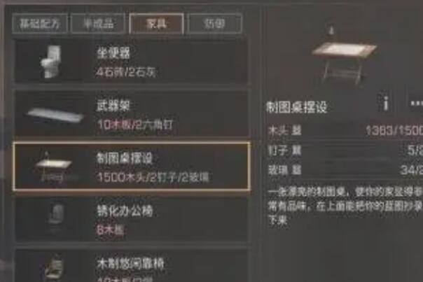第一、首先,我们必须准备的是一个绘图桌,准备需要的数据,木头,钉子,和玻璃,信息比较简单,能够直接正家具制造机里面找到这些材料。