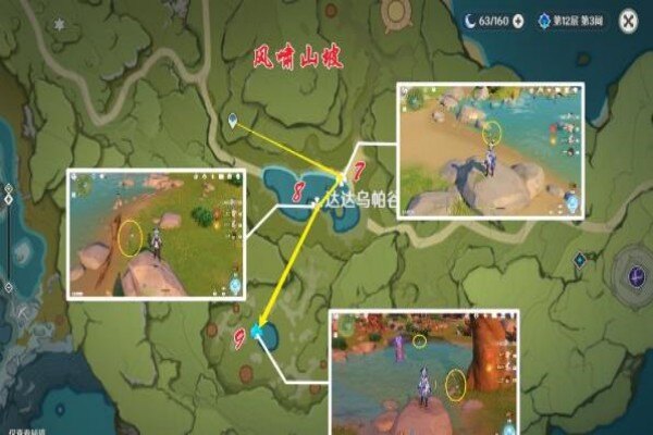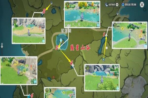 1、我们看看区域一,坠星山谷,以下图片所示一共有六个采集点,玩家大约务必几分钟的时间,采集点1-6,一共能够采集到十三个嘟嘟莲。