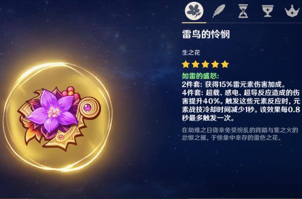 这套圣遗物是从攻击力,防御力,生命元素精通以及元素充能够证物中属性中随机一种作为主属性。则从攻击力百分比、防御力百分比、生命值百分比、元素精通以及元素充可以效率5种属性中随机一种作为主属性两件套的话可以为角色装备带来15%的雷元素伤害,加成4件套的装备能让角色再进行打超载感电超导,放反应的时间可增长40%,的伤害打超机化反应的时刻,甚至还可壮大20%的反应伤害,倘如果再触发超载超导感,电超绽放这一类的反应,能让元素的工艺CD减少一秒,总的来说这套圣遗物主打的就是雷元素的伤害提升。