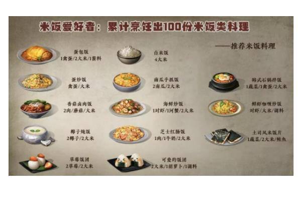 1.主食类的话就有很多是以米饭为主,大体的食物菜品有白米饭,蛋包饭,蛋炒饭,煲仔饭,红肠饭,石锅拌饭,香菇卤肉饭,椰子炖饭,南瓜手抓饭,海鲜炒饭,菠萝饭,鲜虾饭。动态都很简单,相应的蔬菜和大米就能制作了,而且大米是这些菜最重要的原料,玩家足以正在游戏中通过种植小麦就可以,蔬菜的话可以正地图上进行摘菜,鸡肉啊,肉类啊,这些是可以兑换在商店里。