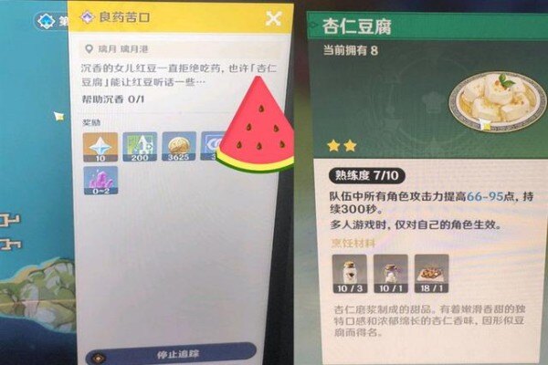 首先,要制作杏仁豆腐,务必先获得食谱。杏仁豆腐食谱的安装方法有两种,分别是通过完成世界任务和通过商店购买。