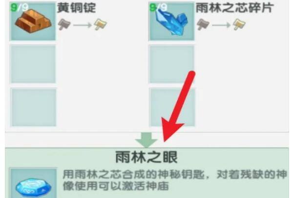 首先,想要正在方才游戏里面制作雨林之眼,那么就要先把务必的数据准备好。其中包括九个雨林之芯碎片,还有6个闪金锭。把需要的内容准备好以后,正工作台上合成就行。