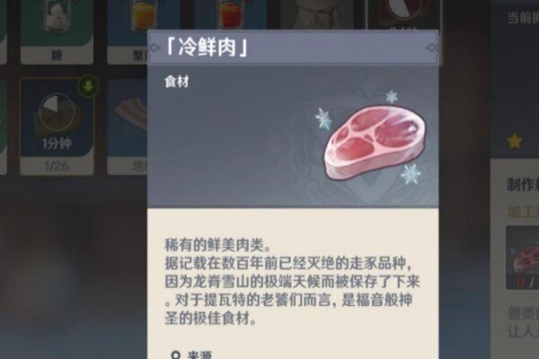 原神是一款开放世界的冒险游戏,玩家能够够收集各种不同属性和功能够的角色,形成自己的队伍。方才游戏中,有些食材是能在商店中购买的,有些食材则务必在野外寻找或者击杀动物获得。其中,冷鲜肉就是一种比较特殊的食材,它是冰冻野猪的产物,只有在龙脊雪山这个新区域才能找到。那么建议一下如何下载冷鲜肉: