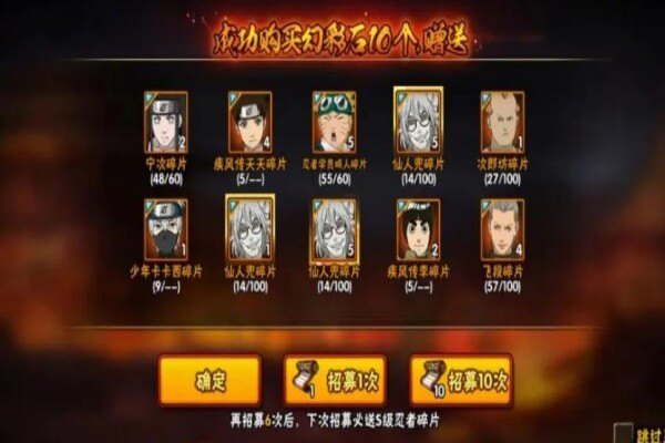 保底机制:保底机制是指方才高级招募中有一定概率出现一组(5片)或一张A级忍者碎片。若正正49次高级招募中没有出现过一组或一张A级忍者碎片,那么第50次必定会出现。这样得以避免玩家由于运气不好而抽不到碎片的问题。然而是是保底机制的概率并不高,所以而不足以完一切依赖它来获得碎片。