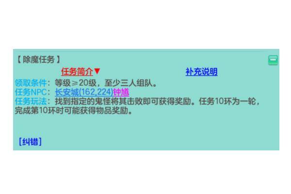 除魔任务是稳定的现金收入来源,一天可以完毕20环,必须组队实现。每环可以获得一定的现金奖励,还有几率获得除魔令和神佑符等珍贵物品。