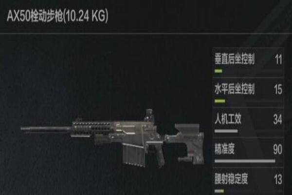 2.AX50基础属性为:垂直后座控制11、水平后座控制15、人机工效34、精准度90、射程180、射速26、重量10.24KG;AX50栓动步枪子弹登录的是12.7x99毫米体系子弹,这把枪的开火模式则为栓动开火。