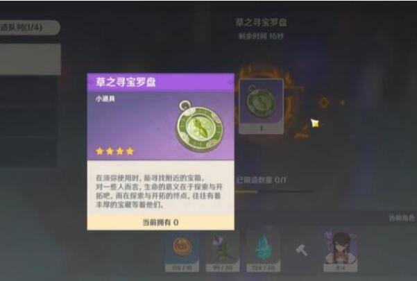 原神中草之寻宝罗盘是就是一种寻宝的道具,能够寻找遗漏的宝箱,每次装备了草之寻宝罗盘,角色的周围就会有金光环绕,然后指引着一个方向,玩家只需要跟着指引的方向走,就可以得到没有被发现的宝箱,对于大批找不到宝箱的玩家来说,拥有一个寻宝罗盘是极其有必要的,有了它得以很容易找到没有集齐的宝箱,得以够是对于宝箱早业业已都找到的玩家来说,这个道具没什么用处了。
