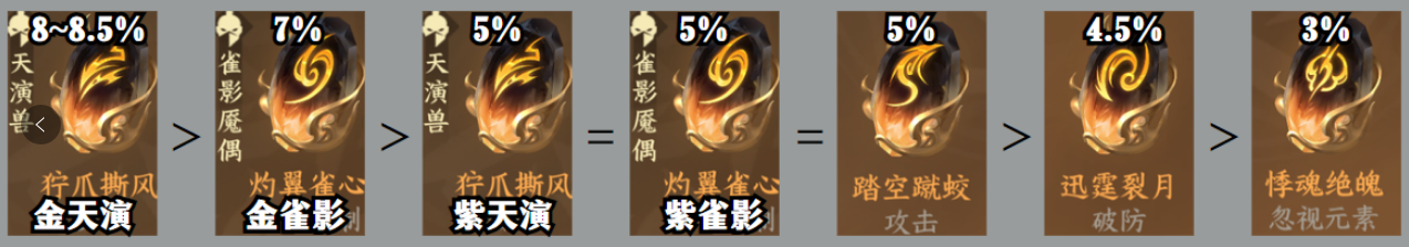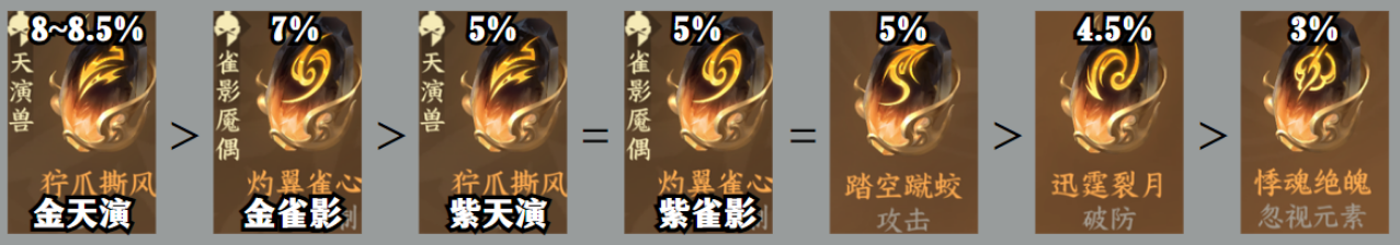 金狞爪撕风(8~8.5%)>金灼翼雀心(7%)>紫狞爪撕风(5%)=紫灼翼雀心(5%)=金踏空蹴蛟(5%)>金迅霆裂月(4.5%)>金悸魂绝魄(3%)
