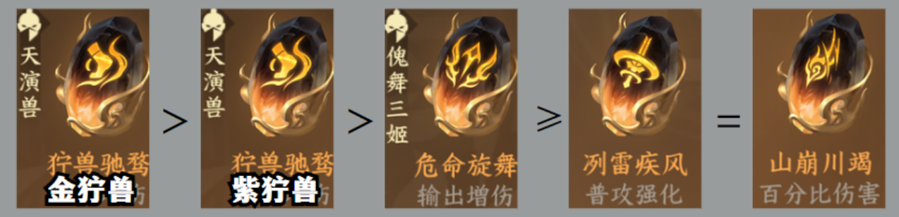 PVE强度:金狞兽驰骛>紫狞兽驰骛>金危命旋舞≥金冽雷疾风=金山崩川竭