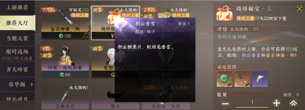 充值项目第四期着手,商城上新直售礼包「绮珍秘宝·三」,可够获得头饰积云香雪。