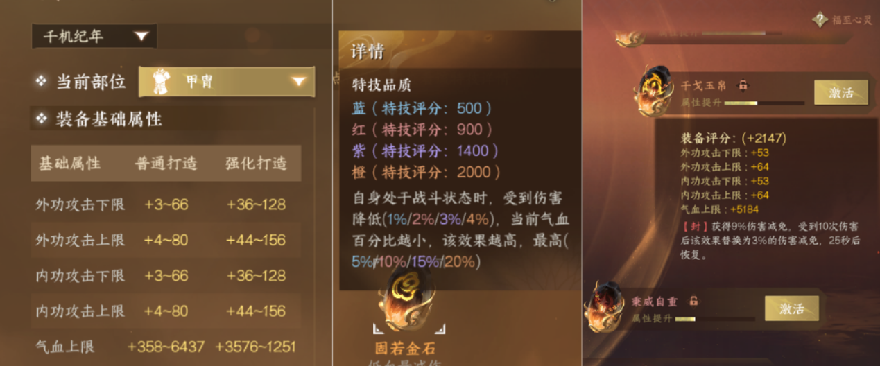 固倘若金石:衣服部位介绍用新的普通打造,最重要得金色/紫色,因为衣服打造基础属性加攻击(和老的金打造能相差80点攻击),红色新打造就比早前金打造加的多,其中固若金石最为力荐。