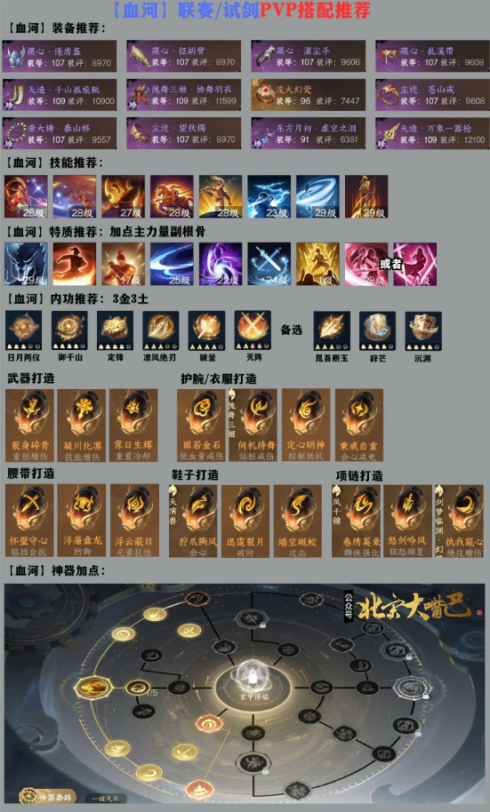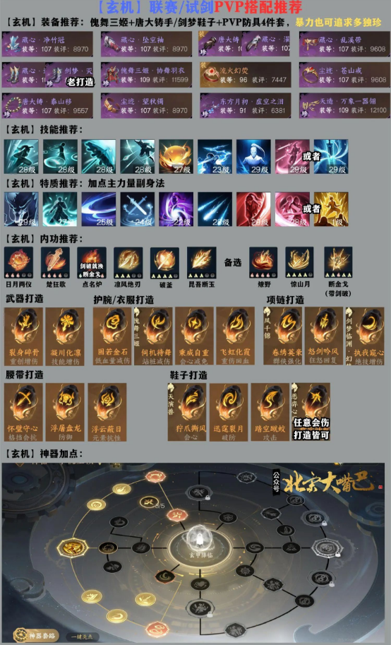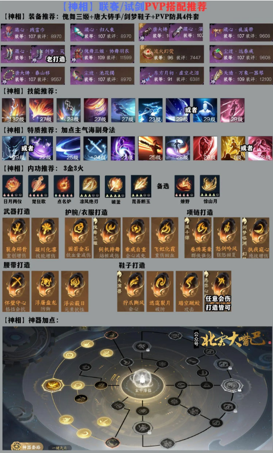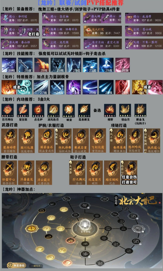 装备建议:防具正常搭配就带PVP4件套+傀舞三姬+唐大铸手走攻击,想要会伤能够够选择傀舞三姬+剑梦鞋。首饰建议戒指+手镯凑出2件套,必带泰山移,项链带东方月初打击杀。