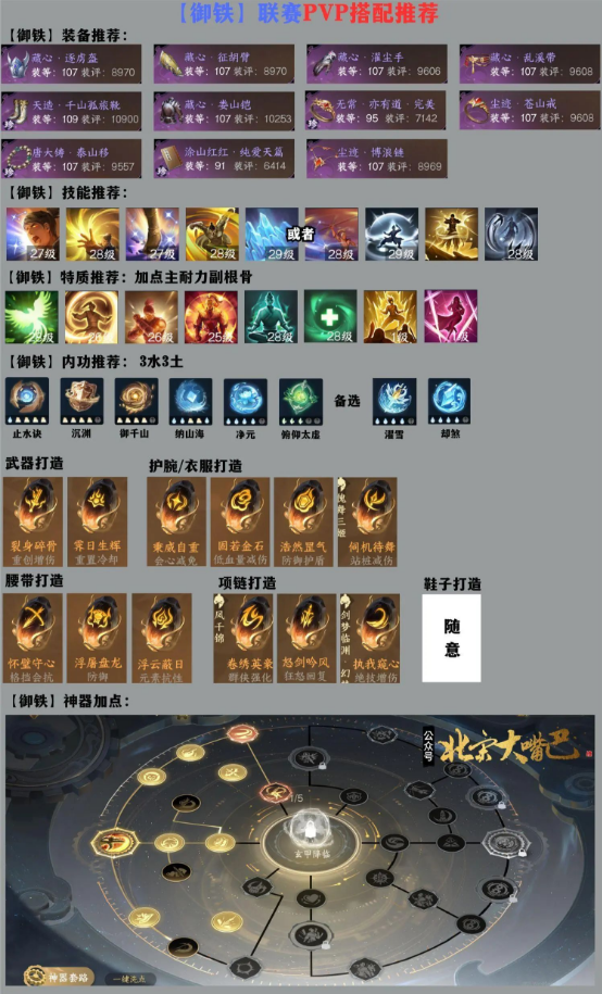 神器精选:天赋选择铁骑定风波 ,点出加强铁画和定魂,剩余点数点出上半部分通用属性,多余的再点职业克制和抵御。