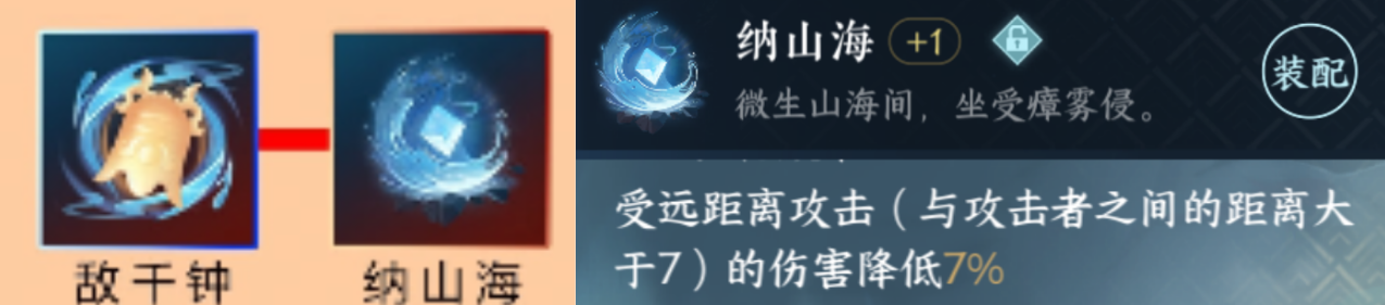 受远距离攻击(距离>7)伤害降低7%。距离7范围很小,只比蛟龙的圈大1码,不及一个燕回风的距离,因此而联赛环境很容易吃满收益,只要不是粘着你打就能够享受减伤成果。倘若有好词条的敌千钟&纳山海可考虑升级,新赛年被绝版。