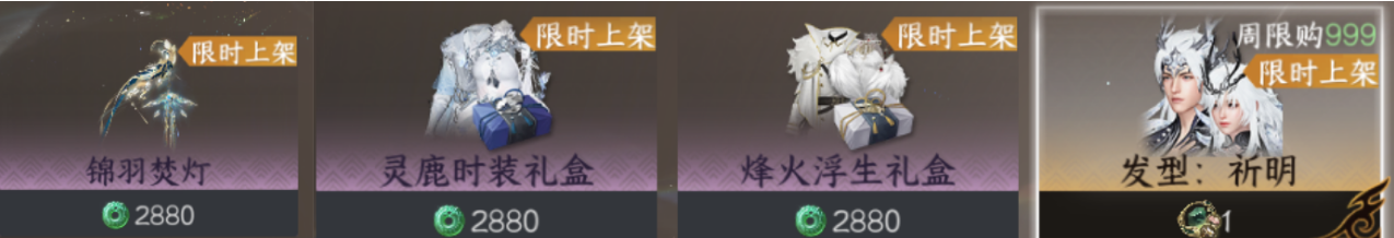 灵鹿时装礼盒、烽火浮生礼盒、天赏发「祈明」、「锦羽」武器外观