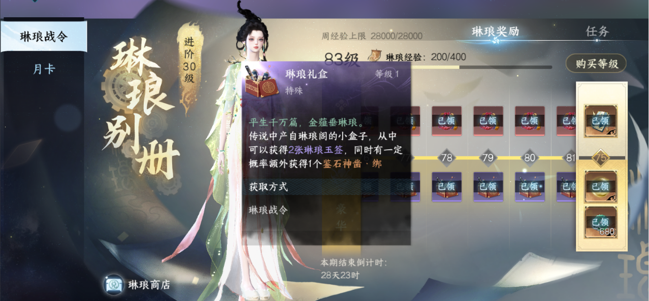 3)琳琅战令持续到8月23日,这版本的战令奖励有增长值得购买!首先3个凿子+6W铜币≈38W铜币比纹玉换铜比例高,还不算时装和养成道具。其次这版本琳琅礼盒新增了绑凿概率下载。20个琳琅礼盒保底能够以出5个绑凿,大概在5~8个绑凿浮动。