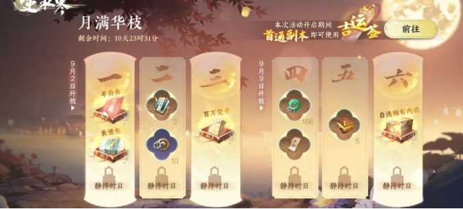 2)9月2号「月满华枝」签到行动启动,明日能够获得半价券。活动时间首通副本即能登录选择是否打开吉运签,中秋减负行即被启动。