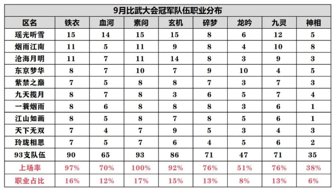 冠军队伍职业上场率:素问100%,铁衣97%,玄机92%,九灵76%,碎梦76%,血河70%,龙吟51%,神相38%。
