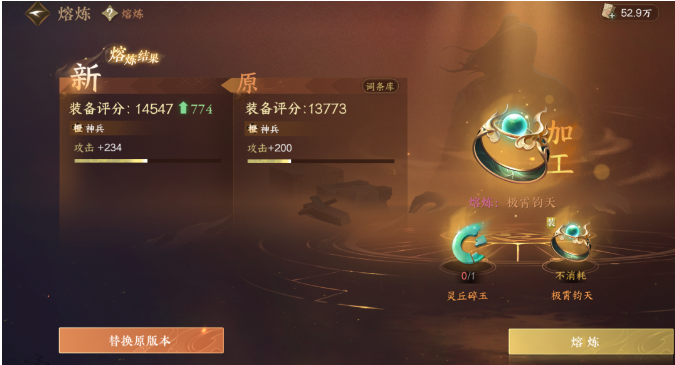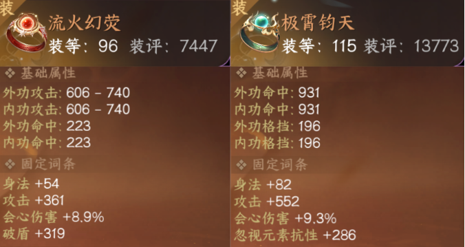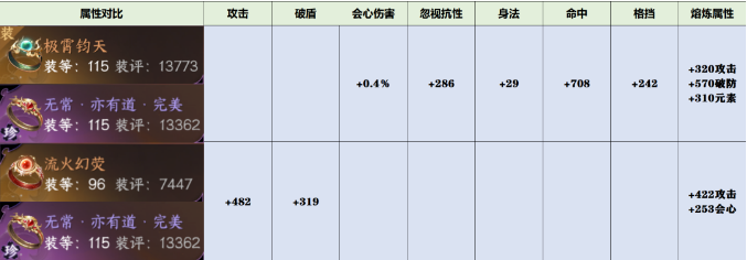 何时替换:刚更新没熔炼,戒环数值低的时刻不推荐更换,等到洗出高数值破防之后,再考虑登录新橙戒+115无常的搭配。