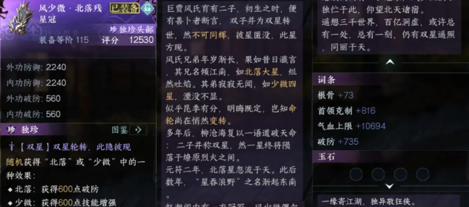 1)风少微·北落残星冠:115装等头盔,独珍功可以以为随机600破防和600技强,可以近似看作300破防+300克制,头盔独珍搭配莫不逆上衣提供320点会心。就目前大多数玩家不缺会心的问题来看,收益都比能够是是113无情护腕,更不用说英雄流派试炼还有115装等的。