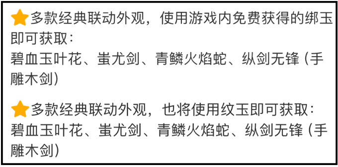 五款经典联动外观,纹玉安装,一开始正方才式写的是绑玉免费获得,后编辑为也可纹玉获得。