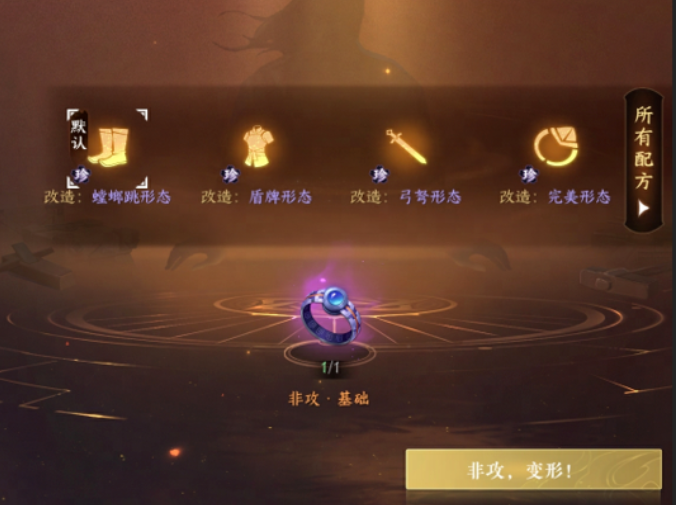 1)通过月升秦时联动产品免费下载。初始形态为戒指「基础」,后续通过燕回风10次,低于50%血受击,造成30次会心伤害,改版为鞋子「螳螂跳」,上衣「盾牌」,武器「手弩」。解锁非攻三种形态后,可加工成戒指·「完美」。