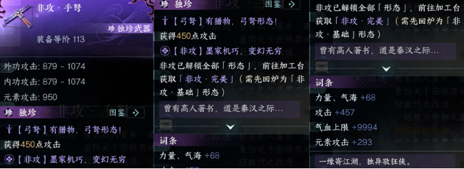 2)其中「手弩」是113装等武器,尽管然比115装等武器少了基础属性,然而独珍多了450点攻击,综合收益高于115百炼武器,成为最近版本除橙武外的毕业武器。