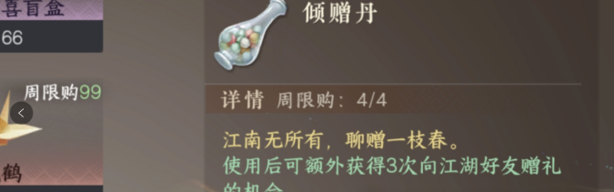 阿初好感赠礼:萤火虫、清冷寒梅、桃溪泥人、柳笛、西湖莲花、郊原野花、布老虎、红叶。除此外还得以花费100绑玉购买绑玉商城的倾赠丹,登录后额外获得3次赠礼机会,倾赠丹周上限4个。
