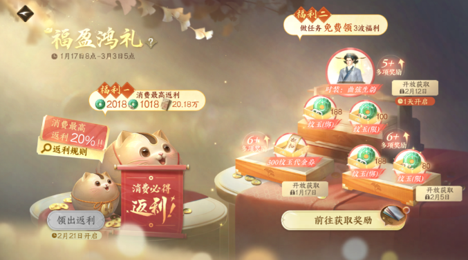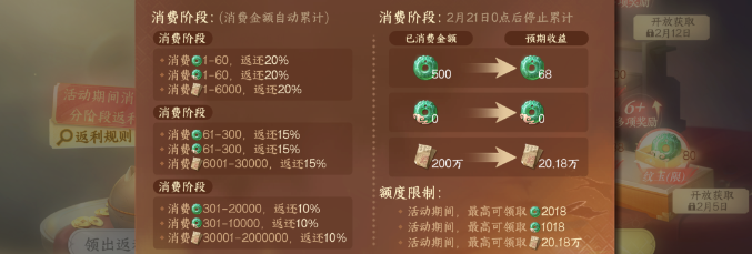 通过指定方法累计消耗交子、限定纹玉、纹玉三种货币到不同时段,能分别享受对应时间的返利比例,最高能够获得返利20.18万交子、1018限定纹玉、2018纹玉!