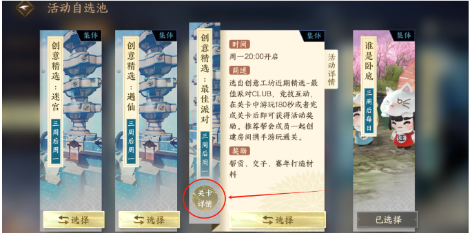 帮会项目-谁是卧底-切换键-点击创意工坊-最佳派对-关卡详情-单人游玩,挂机3分钟领取500帮贡