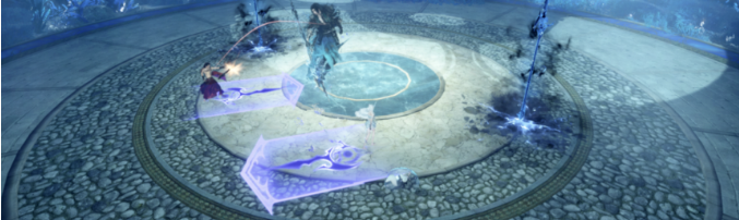 蓝色·寒霜之潮:两名被标记玩家对撞生成冰墙,用于阻挡后续「游锋之刃」。成功抵挡后掉落「寒霜之势」,拾取后下次蓝色对撞生成更大冰墙。