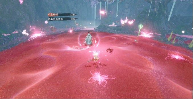 孙白微在战斗中会持续生成蝴蝶,当场上存正在5只蝴蝶时被释放一切屏伤害,玩家需在蝴蝶爆炸前拾取以阻止该机制触发。蝶恋花时刻额外产生地面陷阱,此时需在应对风摇筝机制的同时关注御铁衣的站位。此外,孙白微会对玩家及栗糕施加双向连线,要求玩家朝场地一侧投掷雪涧草球吸引栗糕后立刻反向移动,倘如果未在5秒内断开连线,则触发群体回血并导致连线玩家持续受伤。